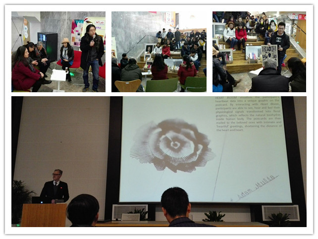 此次活动,我系师生首先听了荷兰埃因霍温理工大学Loe Fijs教授的题为《从生理信号到艺术创作》的专题讲座,我们感受到了新媒体艺术的魅力,也感受到艺术创作通过跨界和融合创作带给我们的巨大空间,教授演示了通过仪器监控人的心跳或呼吸,并将特有的信号输出自动绘制出一朵朵美丽的花朵,并将这独一无二的花朵制作成明信片的过程,我们在感受到科技魅力的同时,更能感受到科技带给我们的人文关怀。Loe Fijs教授的研究方法和态度更是值得我们学习的。接下来,南京艺术学院金昌庆教授为我们带来了题为《全媒体艺术思维与创新》的讲座,我们了解了“全媒体”的理念和应用,在理论指导的基础上,为我们开发新的产品开拓了新的道路。