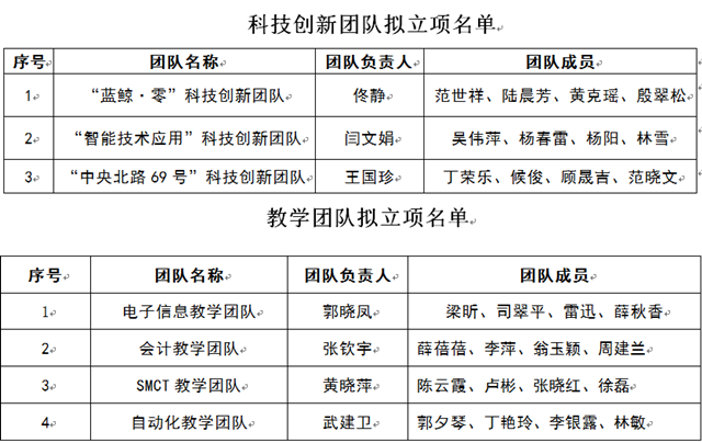 根据《乐投线上平台(集团)官方网站科技创新团队建设管理办法(试行)》(南机电院[2016]38号)、《南京机电职业学院教学团队建设与管理办法(试行)》(南机电院[2016]37号)的有关规定,经校内公开申报、资格审查和专家评审,确定乐投线上平台(集团)官方网站拟立项科技创新团队3个、教学团队4个,现予以公示,名单如下: