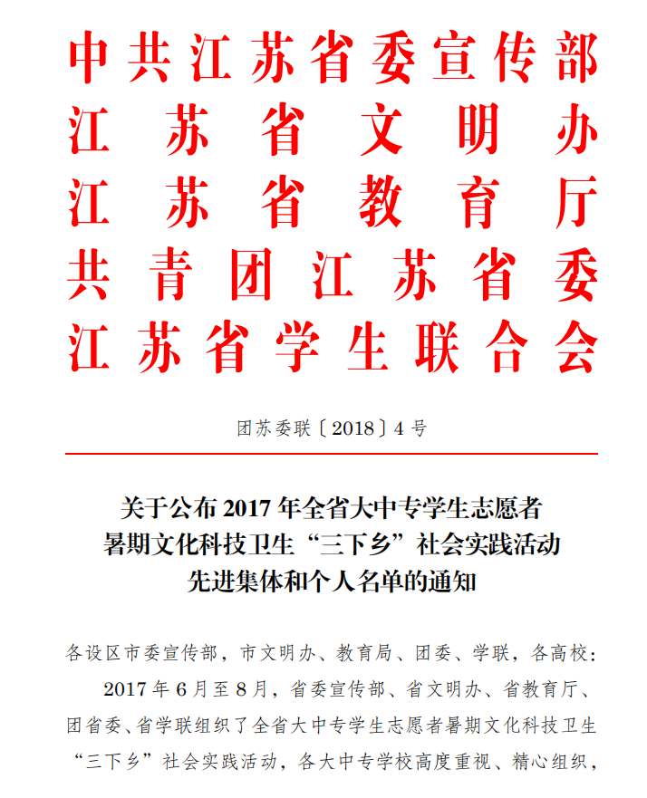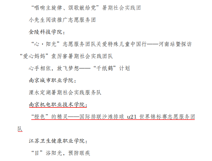 近日,中共江苏省委宣传部、江苏省文明办、江苏省教育厅、共青团江苏省委对在2017年全国大中专学生志愿者暑期文化科技卫生“三下乡”社会实践活动表现突出的单位进行表彰通报表扬。我院“橙色”的精灵—国际排联沙滩排球U21世界锦标赛志愿服务团队,荣获“优秀团队”荣誉称号。