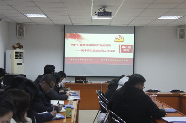 2019年1月3日下午,学院党委中心组(学习)扩大会议在弘德楼107会议室召开,集体学习党的十九大精神,重点学习我们为什么坚持和加强中国共产党的领导,以及如何筑牢高校思想政治工作阵地方面的内容,学院全体中层以上干部参加会议。
