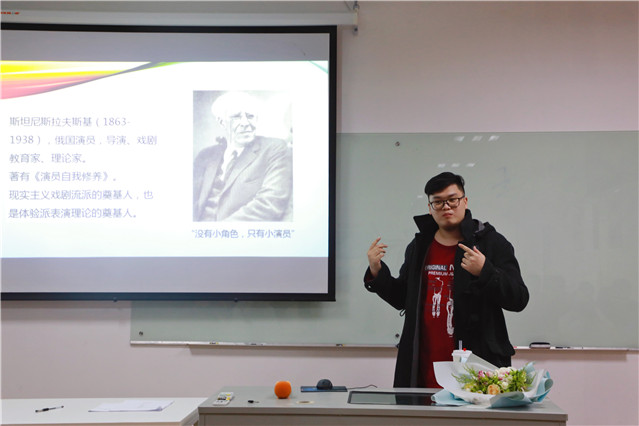 在讲座中,毛一轩老师首先为大家介绍了话剧表演的祖师爷“斯坦尼斯拉夫斯基”。斯坦尼斯拉夫斯基是名著《演员的自我修养》的撰写者。是体验派表演形式的创始人。在他的流派中,主要在乎的是真听、真看、真感受。也就是我们平时所说的“真”。而李·斯特拉斯伯格创建的方法派,主要追求的是“善”。我国戏剧大师梅兰芳先生创建的戏剧派讲究“美”。这三种流派构成了我们现在所常说的“真、善、美”三种意识形态。