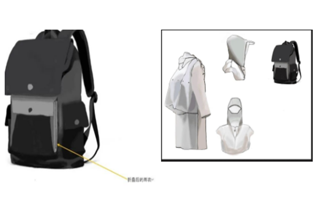 目前,学生所使用的各种书包,仅用来存放文具及物品,均不带防雨装置。学生上下学时,如遇下雨天,又背书包,又打雨具,很不方便。有时突遇下雨,又没带雨具,即连人带包全部淋湿,给学生的生活带来一定困扰,针对这个痛点我设计了一款雨衣书包。