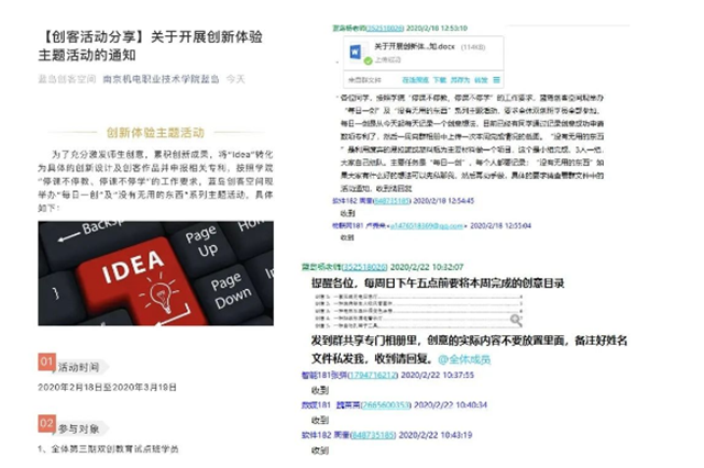 为确保学院创客相关工作在有效防控新型冠状病毒感染肺炎疫情的前提下有序开展,蓝岛创客空间办公室认真学习贯彻习近平总书记重要讲话和重要指示精神,坚决执行学院制定的2020年春季学期延期开学教学工作方案,并于2月19日通过微信公众号,QQ群等线上方式向全院学生发布了《关于开展创新体验主题活动的通知》,号召学院创客们30天的时间里每天记录一个创意,并在每周末提交一周的记录。蓝岛创客空间创客导师则在线上提供相应的创客指导,实现“线下开学延期、线上开课不延期”,创客教育“停学不停课”。