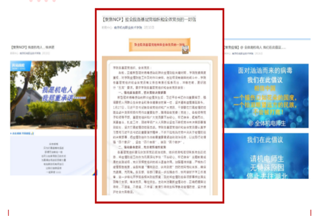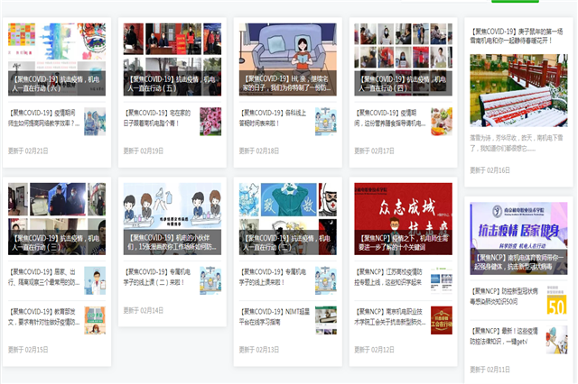 2、推文内容丰富:截止到目前,学院官微和学工微信推文超过150篇,浏览量累计达12万次。学院官微设立聚焦COVID-19专版,杜绝信谣、传谣现象,学院各宣传平台、师生联络群目前无煽动性信息,无谣言,提高了疫情防控的科学性和有效性,凝聚起了众志成城、攻坚克难的强大正能量。根据不同受众接受信息的多样化需求,实行分众化、对象化传播发放、与学工处联动,师生同步宣传,及时收集整理学院防疫战线典型事例,设立了“共同战役,机电人在行动”、“跟着南机电体育教师居家健身”、“停课不停学,NIMT线上课集锦”、“辅导员之声”、“书记抗疫特辑”等特色版块,把学院部署、部门经验、师生爱心行动、教师分享等声音第一时间传播出去,展现我院师生抗击疫情、共克时艰的精神面貌。