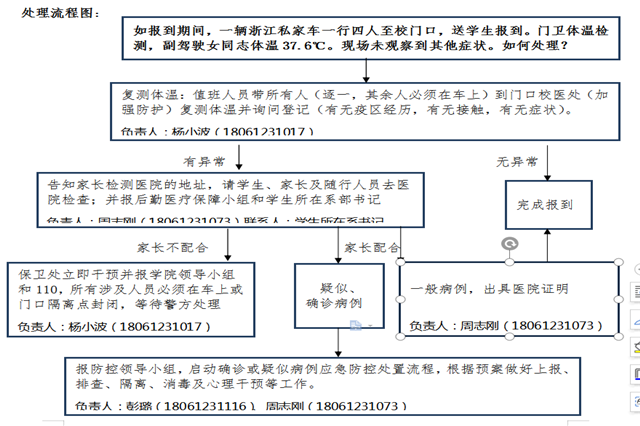2、实景案例、模拟演练、流程总结:针对学院疫情防控方案全体教职工在完成理论学习后还需参加模拟案例演练。列出的实景案例包含与疫情相关的校园突发事件如:开学报到期间,一辆浙江私家车一行四人来到校门口,说是送学生报到。门卫体温检测,副驾驶女同志体温37.6℃。现场未观察到其他症状。一位学生报告宿管老师,他们宿舍有个学生可能发烧,伴有偶尔咳嗽,还在床上休息。开学第二周周二下午课间,信息系王老师突感不适,经查体温为37.8℃等。这些案例贴近校园生活,是在疫情防控期间对处理事件的相关人员解决问题的实践能力,理论知识、操作、应急处置等综合技能的考验,具有很强的实用性和针对性。切实提升了学院师生自我防护能力、提高了学校疫情防控专业化水平,为坚决打赢校园疫情防控阻击战提供保障。