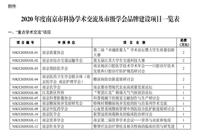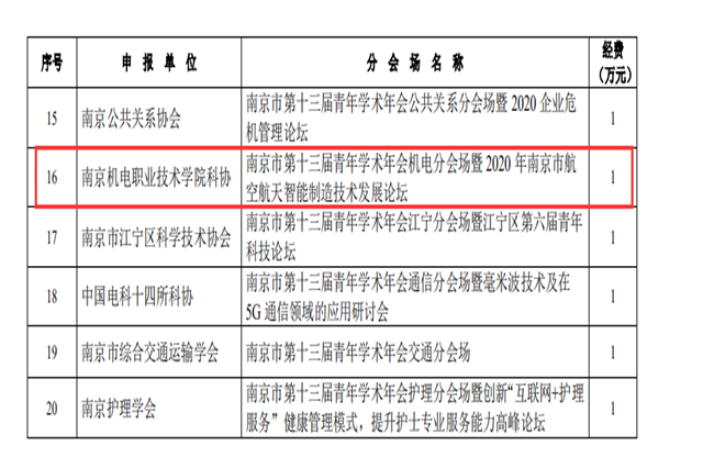近日南京市科协公布了2020年度南京市科协学术交流及市级学会品牌建设项目的评审结果,我院科协成功获批两项2020年度南京市科协“学术交流及市级学会品牌建设”重点项目,分别为:2020年南京市科协“青年科学家论坛”——航天科技发展与职业教育发展论坛、2020年南京市第十三届青年学术年会机电分会场暨2020年南京市航天航空智能制造技术发展论坛。