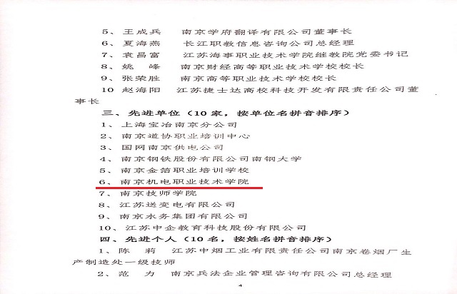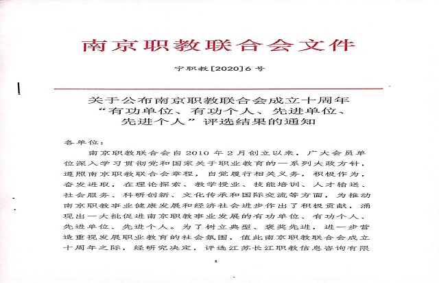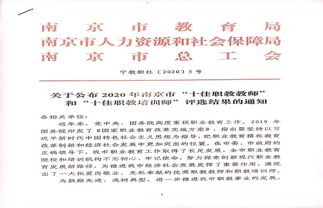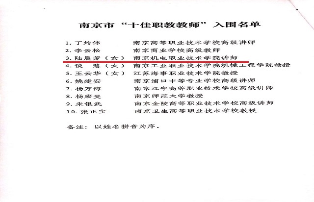 在此次南京市职教联合会成立十周年先进单位评选中,我院被授予“先进单位”荣誉称号,陆晨芳老师入围南京市“十佳职教教师”。