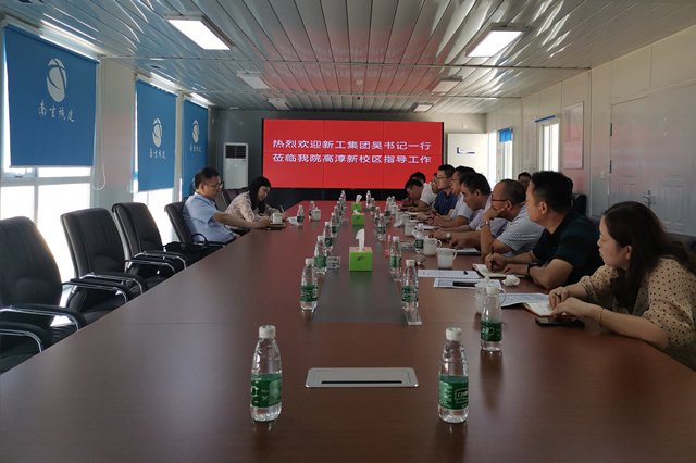 现场考察结束后,吴书记一行前往新校区建设指挥部会议室参加项目推进会。首先,南京城市建设管理集团高淳分公司总经理李月明介绍了项目建设进展情况,随后孔院长介绍了新校区投用及开学准备情况,赵院长就学院开学需应对的安全保卫、交通秩序、城市管理等工作的推进情况进行了汇报。