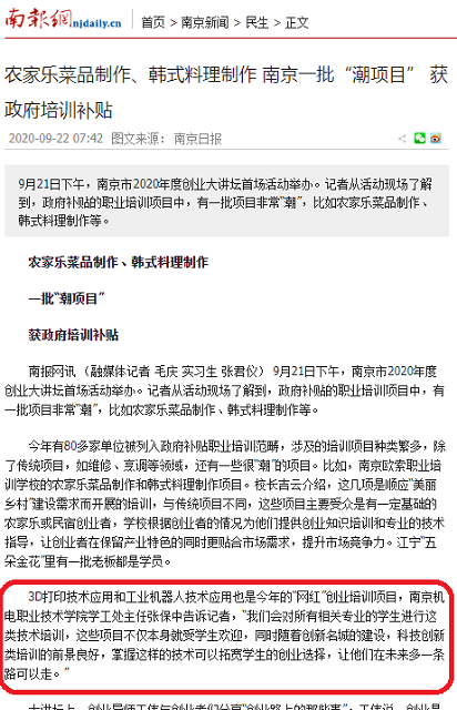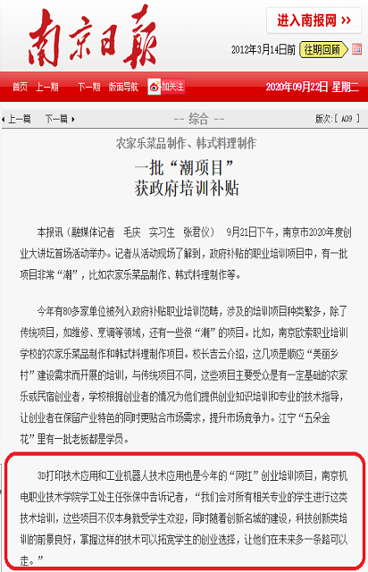 2020年9月21日下午,我院受邀参加了在南京市人力资源和社会保障局指导下,由南京市职业技术培训指导中心主办、南京市华普赢之道职业培训学校承办的南京市2020年度创业大讲坛首场活动。南京日报、现代快报、南报网等多家媒体对我院学生参与创业、技能培训项目的相关情况进行了采访和报道。