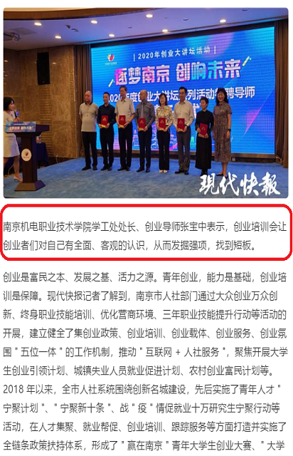 2020年9月21日下午,我院受邀参加了在南京市人力资源和社会保障局指导下,由南京市职业技术培训指导中心主办、南京市华普赢之道职业培训学校承办的南京市2020年度创业大讲坛首场活动。南京日报、现代快报、南报网等多家媒体对我院学生参与创业、技能培训项目的相关情况进行了采访和报道。
