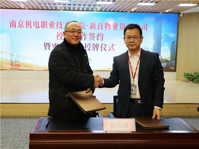 仪式上,主持人介绍了双方代表,对副院长赵学洪一行到来表示热烈的欢迎,对双方合作协议的签署表示祝贺,并介绍了《新匠力培训方案》。首先,副总裁蔡丛辉致欢迎辞,并介绍了新百物业的发展史及开展校企合作的思路;随后,副院长赵学洪介绍了学院历史、学院教学和实习实训的情况,同时表示学院希望双方加强合作,通过一系列的深入合作进一步增强学生的动手能力,实际操作能力,适应未来的发展需要;最后,副总裁周雷对我院的教育教学活动给予了充分的肯定,表达了行业需求人才的迫切愿望。他表示,南京新百将与机电学院通力合作,为行业和社会培养综合性、技能型P序列和管理型M序列的人才。