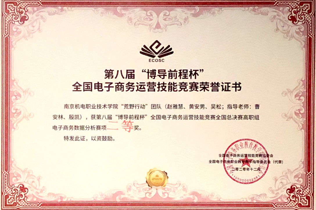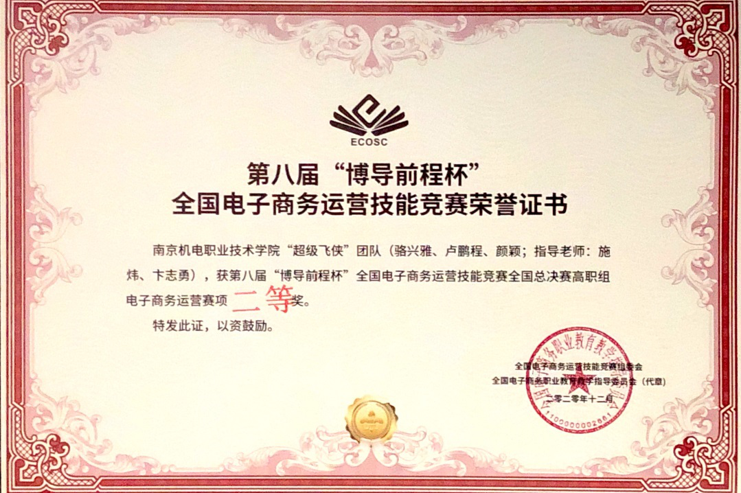 2020年12月29日,第八届“博导前程杯”全国电子商务运营竞赛决赛在苏州经贸职业技术学院举行。乐投线上平台(集团)官方网站电子商务运营“超级飞侠队”团队(骆兴雅、卢鹏程、颜颖;指导老师:施炜、陈洁)以及电子商务数据分析“荒野行动队”团队(赵雅慧、吴松、黄安男;指导老师:殷凯、曹安林)双双荣获高职组全国总决赛二等奖。