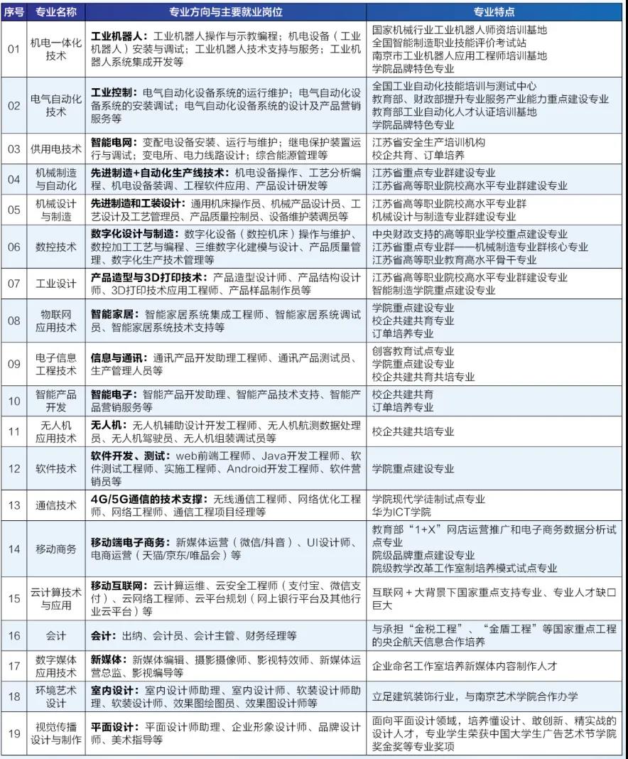开设专业涵盖机械、电子、计算机、自动控制、艺术设计等多个领域。为适应智能制造产业发展需求,学院积极对接“中国制造2025”和南京市“智能制造名城”建设规划,围绕智能制造产业链,优化专业结构、调整专业方向,重点瞄准网络协同制造、工业机器人、高端成套装备、3D打印等智能制造相关产业,培养创新性技术技能人才。