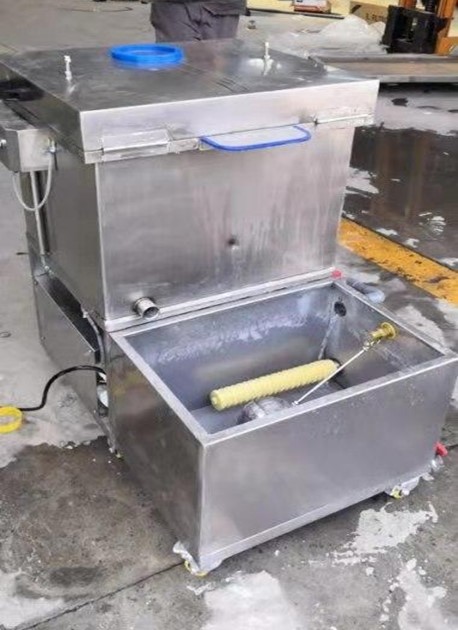 针对国内垃圾桶清洗的空白市场,自动化高效清洁机包括槽体、隔板、旋转台和垃圾桶,旋转台上对称开设有四个圆孔,圆孔的内径略小于垃圾桶的开口内径,旋转台上位于圆孔边缘周向设置有卡块,槽体内与其中三个相邻圆孔相对应的位置处依次设置有内壁清洁机构、外壁清洁机构和风干机构;本发明一种自动化高效清洁机构,该种自动化高效清洁机构,内壁清洁机构对垃圾桶内壁进行清洁,外壁清洁机构对垃圾桶外壁进行清洁,风干机构对垃圾桶内壁进行风干,从而实现了垃圾桶的高效清洁,且整个过程自动化程度高,减轻了清洗工的劳动强度,通过旋转台带动垃圾桶旋转到内壁清洁机构、外壁清洁机构和风干机构上,从而可以实现连续自动清洁,清洁效率高。 |