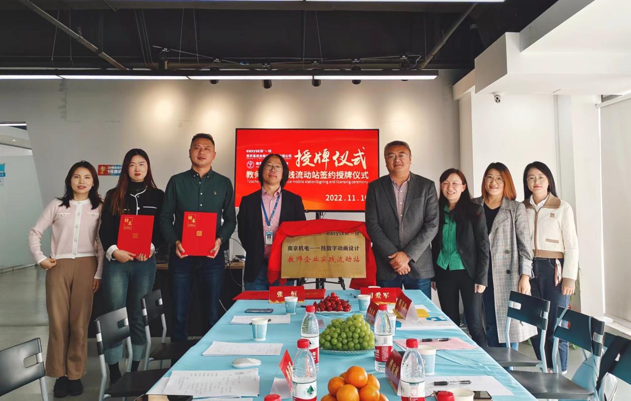 为全面促进校企交流合作,着力打造校企共建、产教融合平台,2022年11月10日,乐投线上平台(集团)官方网站赴南京易技未来动画制作有限公司举行“南京机电-一技数字动画设计教师企业实践流动站”签约揭牌仪式。我院党委委员、副院长刁爱军、科研与校企合作处处长李木香、人文社科系系主任曹安林、人文社科系系部书记叶绘及数字媒体技术专业相关教师与南京易技未来动画制作有限公司董事长张恒、总经理王群及流动站企业联络人徐倩倩共同见证了这一重要时刻。