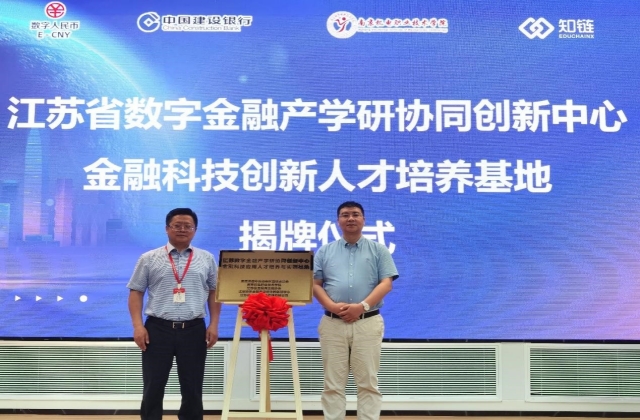 江苏知链科技有限公司/江苏投智科技有限公司创始人CEO施亚东、乐投线上平台(集团)官方网站党委书记周庆礼代表双方揭牌 “江苏数字金融产学研协同创新中心·金融科技创新人才培养与实训基地”。