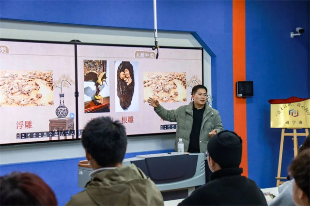 在开班仪式之后,研学班开展首次“彩本影雕”集体活动,高淳木雕非遗代表性传承人、区人大代表邢志鹏为全体学员授课。邢志鹏从种类、起源、发展三个方面为学员们详细讲解了高淳三雕之首——木雕的渊源与发展,并带领大家体验了木雕的过程和技巧,每一位学员也都在邢老师的指导下,为自己亲手制作了桃木梳。