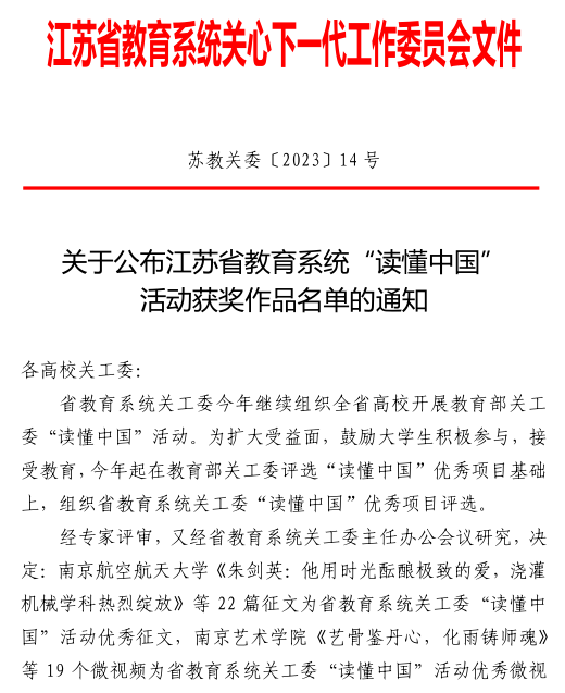 近日,我校在江苏省教育系统关工委举办的“读懂中国”活动中,凭借纪录片《老少共话二十大 踔厉奋发新征程——师恩如海 教泽流芳》荣获“优秀微视频”奖,充分展示了我校在思政教育和“四史”教育方面的显著成果。