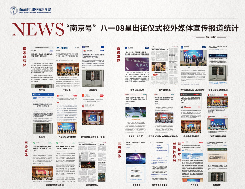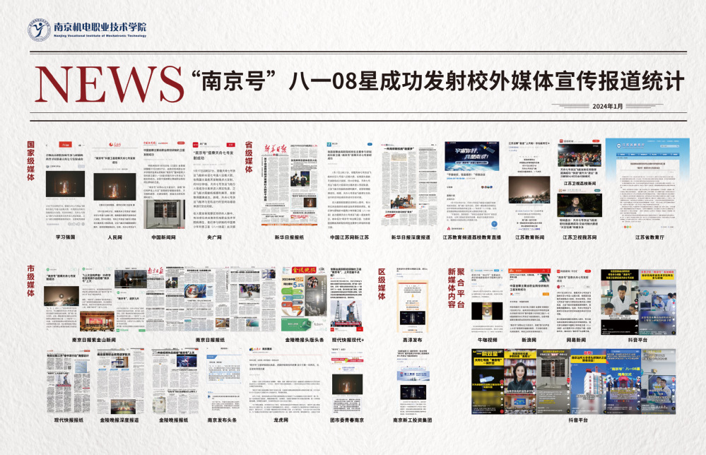 省市级媒体深度报道。省级媒体新华日报率先在头版头条刊登了卫星成功发射的消息。市级媒体南京日报在头版、金陵晚报在头版头条第一时间进行了报道。省教育电视台专门到校开设特别访谈节目。江苏卫视跟踪专门报道......新华日报还以“一所高职院校的‘造星梦’”为主题进行了深度还原。这些报道通过采访相关专家、学者以及参与项目的学校领导和师生团队,以独特的视角和专业的深度深入挖掘了卫星发射背后的故事,探讨了其在人才培养、科普教育、科技创新、航天强国等方面的深远意义,也为读者和观众提供了更加全面、活泼的阅读体验,有效提升了学校的知名度和美誉度。