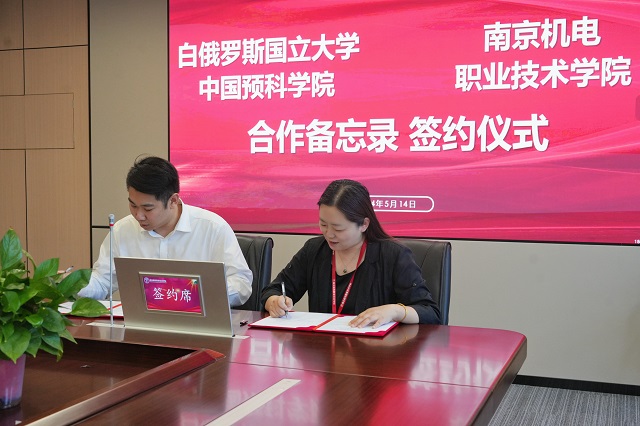随后,我校与白俄罗斯国立大学中国预科学院签署了合作协议。签约仪式上,学校党委委员、纪委书记、工会主席姜振宇与白俄罗斯国立大学中国预科学院中方院长张践共同为“南机电•中俄教育中心”揭牌。