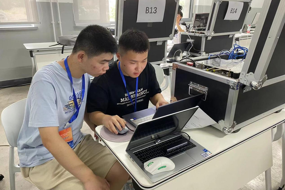 我校师生毅然放弃假期时光,选择在高温下刻苦训练,炎炎夏日汗水湿透了衣衫却丝毫没有影响他们的热情和迈向目标的决心,每一条指令的编写、每一次的调试都意味着离成功更进一步。决赛现场试题分为基础分和附加分,我校是全场唯一附加分获得满分的参赛队!