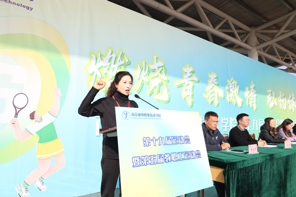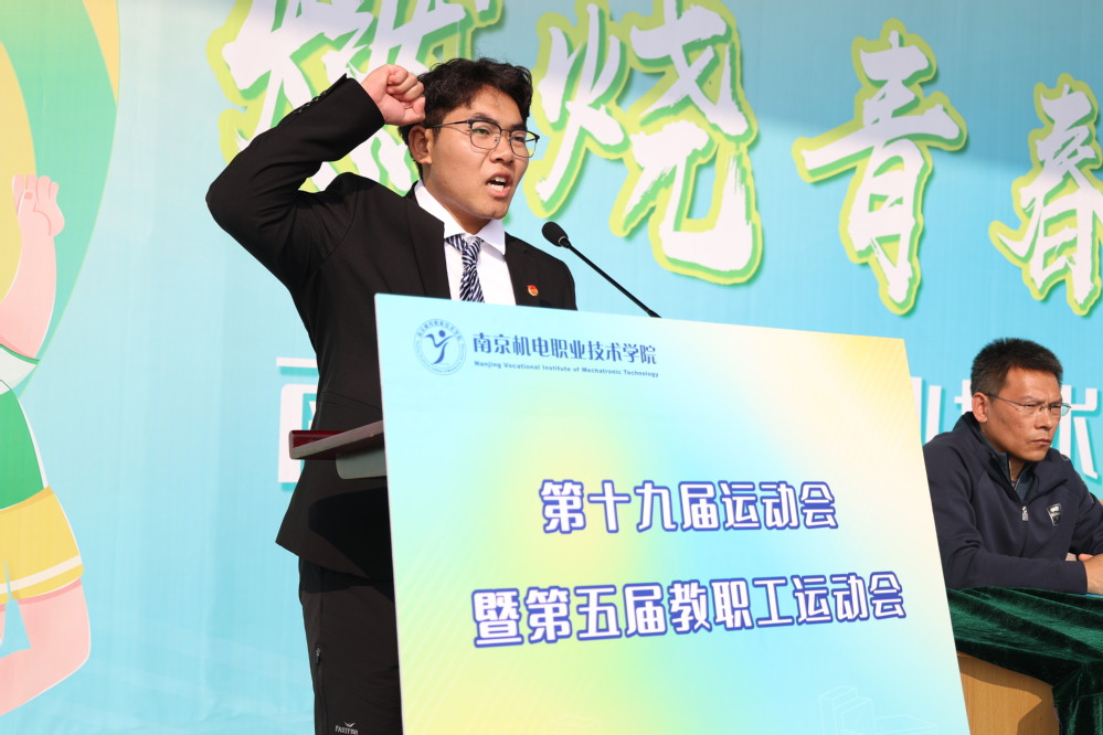 电气自动化231班马天鹰代表全体运动员庄严宣誓,在比赛中遵守规则,尊重裁判,尊重对手,服从安排,以饱满的精神和积极向上的态度完成各项比赛;人文社科系体育部陈文继代表全体裁判员庄严宣誓,将严格遵守裁判员纪律和各项竞赛规则,文明裁判,做到公平、公正、公开并准确评判每一项比赛成绩,确保比赛顺利进行。机械制造及自动化241班刘轩代表全体志愿者郑重宣誓,将以饱满的热情,和认真的态度投入运动会志愿服务中。以高度的责任心,认真对待每一项任务。以实际行动,践行志愿精神!