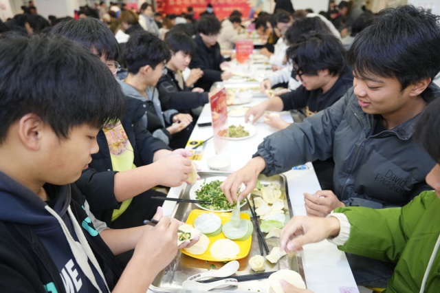 七彩饺子,它们不仅仅是食物,更是团圆和和谐的象征。每一种缤纷的色彩都承载着独特的祝福和美好的愿望。在冬至这个特别的日子里,同学们从洗菜、切菜,到和馅、包饺子,全程自己动手完成。同学们动手包饺子,有的人手法娴熟,包出的饺子形状规整美观,而新手们虽略显生疏,却以独特的创意赋予饺子各异的形态。饺子的形状千奇百怪,各具特色的饺子同时出现在了一个面板上,就好比来自五湖四海的同学们,在南机电相遇!