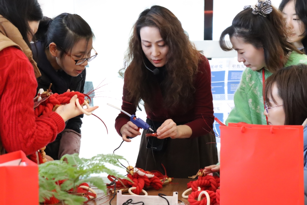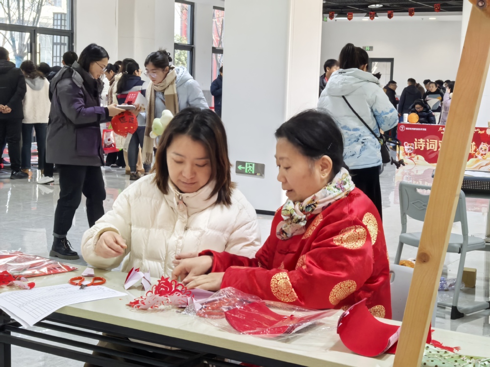 活动现场,两大主题区域交相辉映,各具千秋。传统文化区内,罐罐奶茶摊位前人头攒动,老师们手捧香气四溢的奶茶,感受民族风味与茶香的完美融合,在品味中开启了一段独特的文化之旅。年画拓印区,体验者热情高涨,亲手将墨汁均匀涂抹于刻板上,再小心翼翼地覆盖纸张、按压成型,一幅幅色彩绚丽、图案精美的年画应运而生,传统工艺在校园内得到了生动传承,同时也唤醒了大家对年俗文化的温馨记忆。剪纸艺术区同样人声鼎沸,在专业人员的悉心指导下,老师们纷纷拿起剪刀,在红纸上灵巧翻飞,纸屑飘落间,一个个“福”字、一幅幅生肖图案便跃然纸上,成为迎接新春的独特礼物。此外,制作纯手工的好运门挂与古法香囊也让老师们亲手编织出对新年的美好祈愿与祝福。