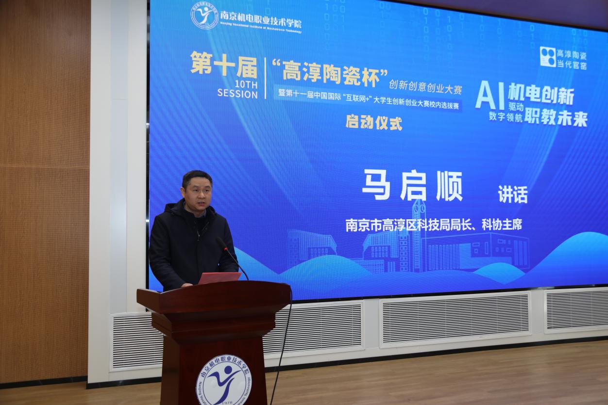 2025年3月18日,“AI驱动机电创新,数字领航职教未来”乐投线上平台(集团)官方网站第十届“高淳陶瓷杯”创新创意创业大赛暨第十一届中国国际“互联网+”大学生创新创业大赛校内选拔赛启动仪式在乐学楼102报告厅举行。南京市高淳区科技局局长、科协主席马启顺,南京高淳高新技术产业开发区管理办公室分管负责人倪友谊,南京高等职业教育创新创业园发展服务中心主任吴凯,江苏高淳陶瓷股份有限公司党委副书记、副总经理周玉明,学校党委委员、副校长刁爱军等领导出席启动仪式。300余名师生代表参加活动,共同见证大赛开幕。