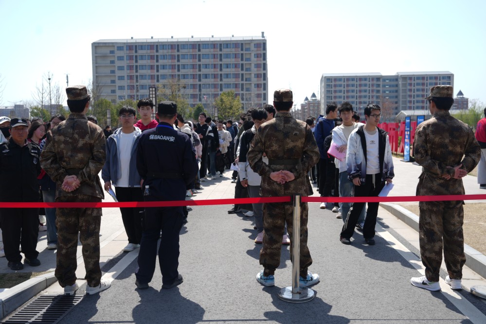 备考教室内,考生们或翻阅资料温习,或闭目养精蓄锐,为专业技能测试做最后冲刺。校园内随处可见身着红马甲的志愿者身影。他们为考生提供路线指引、答疑解惑。