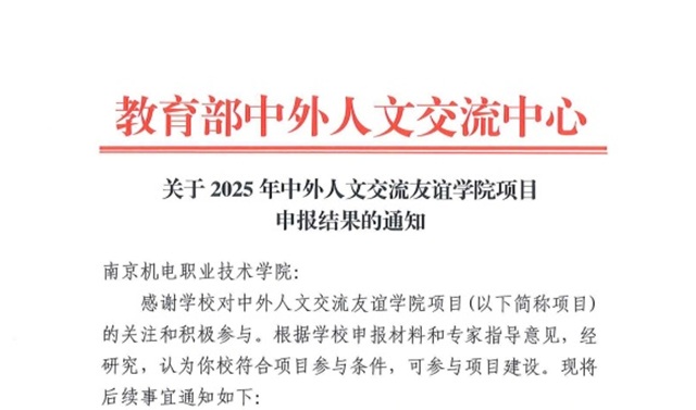 为提高学校国际交流与合作建设水平,积极扩大对外开放,深入实施“职教出海”,学校积极开展中外人文交流友谊学院项目申报工作。近日,经教育部中外人文交流中心批准,我校获批立项中外人文交流友谊学院项目。