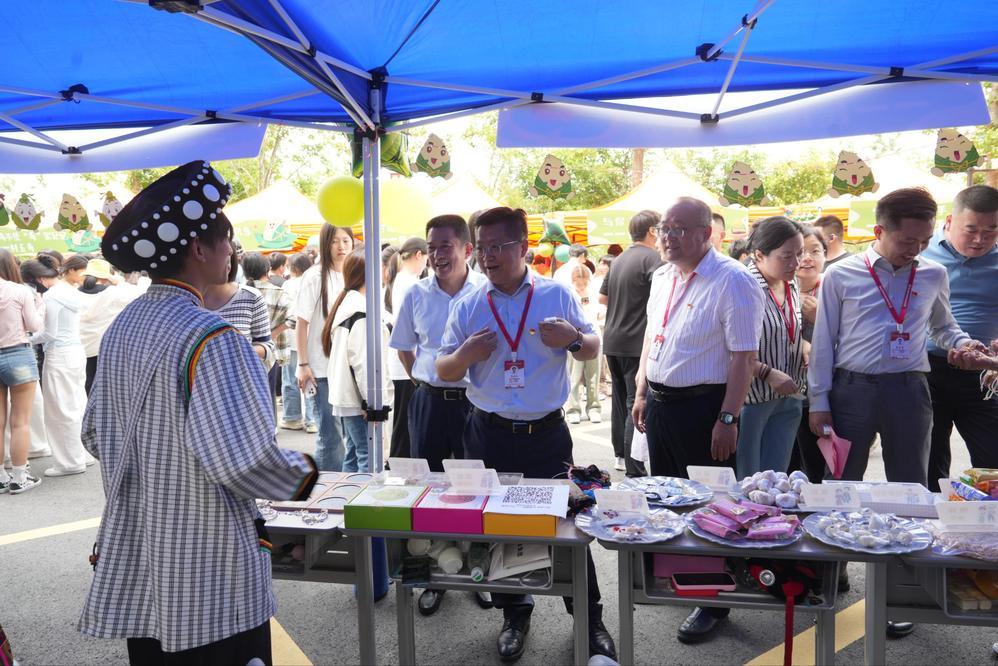 当天,学生工作处在学生公寓润思生活服务站广场开展了“同心筑梦·礼敬国粹——2025年端午节系列活动”。活动现场精彩纷呈、各具特色,共开设23个展位,从端午知识、习俗、美食等方面,全方位向全校师生展示端午暨特色少数民族文化,吸引众人驻足参与。在少数民族展位上,身着民族服饰的同学们热情洋溢,不同文化在此碰撞,促进了多元文化的交流与融合。