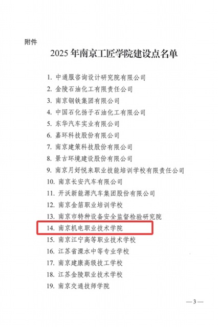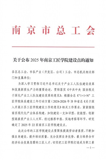 近日,南京市总工会印发了《关于公布2025年南京工匠学院建设点的通知》,学校成功入选2025年南京工匠学院建设点名单。这一成果既是对学校多年来深耕产教融合的高度肯定,也为南京打造高素质产业工人队伍注入新动能。