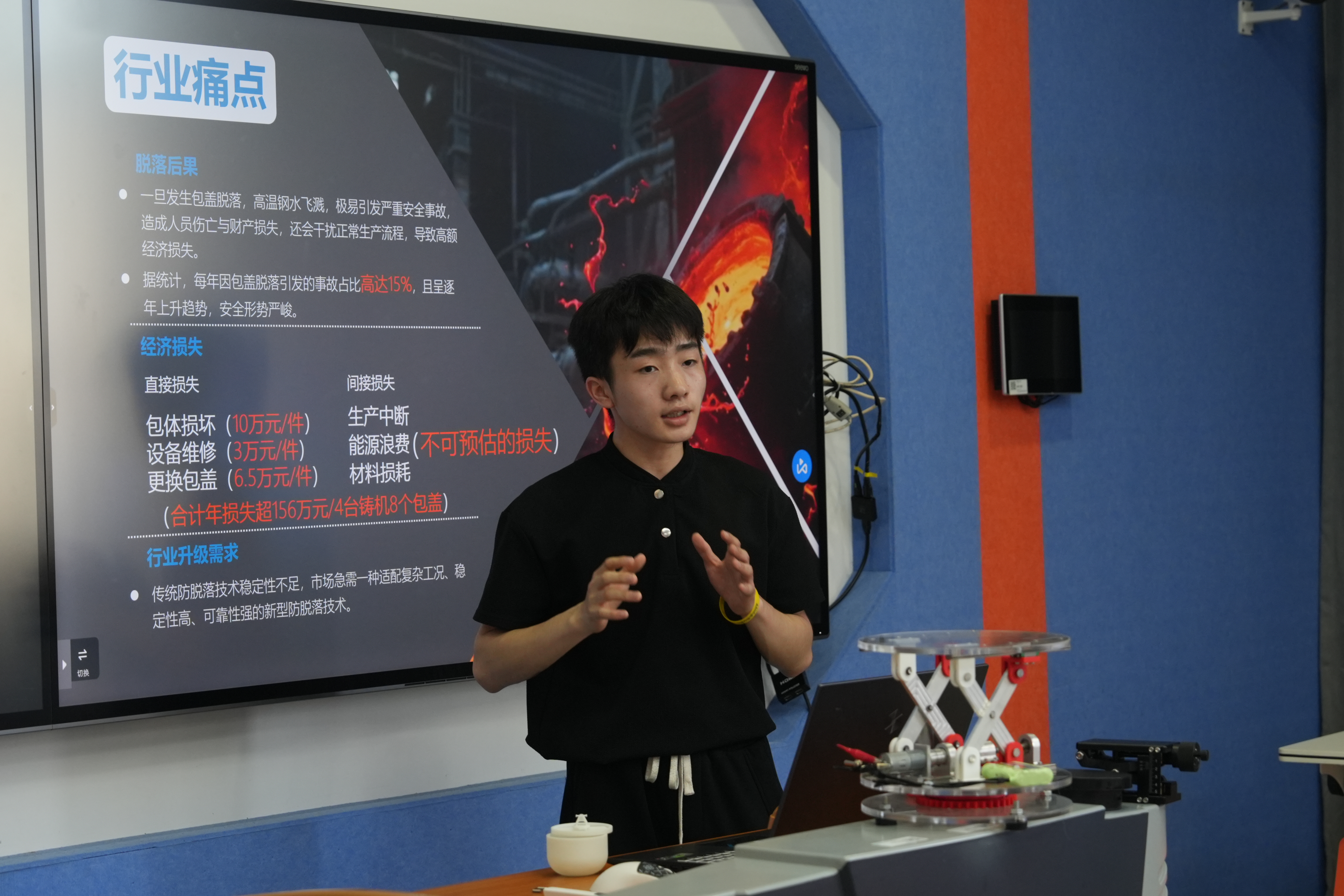 在创新制作组,自动化工程系教师袁芬团队的《虚拟机器人仿真实验平台设计》让学生可以在虚拟环境中反复进行装调和调试练习,全面掌握设备的结构和工作原理,提高实践能力,同时实现在线实训教学,打破时间和空间的限制,满足远程教学的需求。机械工程系学生林志远团队的《旋转升降展台》通过模块化设计,将旋转与升降功能整合,采用电动调节提升稳定性,结合数字化设计与制造技术优化开发流程,打造一款智能旋转升降一体化展台。