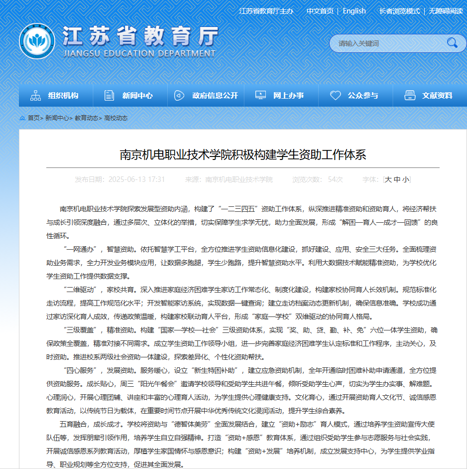 近日,江苏省教育厅报道:乐投线上平台(集团)官方网站积极构建学生资助工作体系,全文如下: