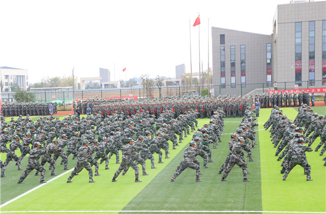 在团体项目擒敌拳和匕首操中,一拳一腿动作整齐划一,利落潇洒;一声声口号铿锵有力,气势恢宏,将整场汇演推向高潮。