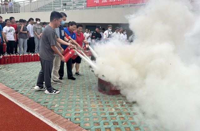 第三环节是由高淳消防救援大队吴浩钰中队长讲解灭火器使用要点,讲解结束后安保人员、后勤工作人员、各系部师生进行灭火实操演练。