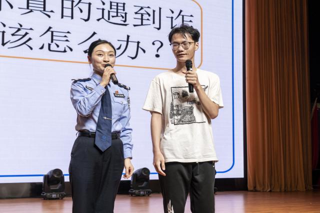 区内保大队警官周莹在《让青春无诈—构建反诈安全网》讲座互动中用通俗易懂的语言以案释法,选取贴近大学生生活的典型案例,让学生深入了解诈骗的典型套路。周警官还随机邀请了经历过骗局的学生分享被诈骗过程,用他们的亲身经历提醒同学们引以为戒。