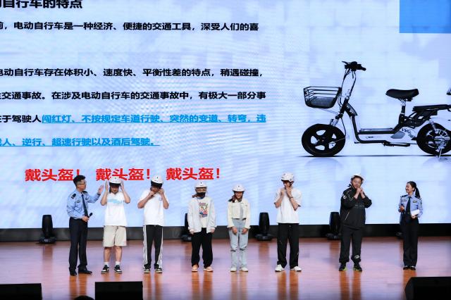 公安分局警官周莹、沈程结合安全教育警示片展示了电动自行车行驶存在的闯红灯、逆向行驶、占用机动车道、超速行驶、不戴头盔、违法载人等严重后果,深入浅出地向学生普及交通安全法规和安全知识,传递“一盔一带”的重要性,邀请学生上台示范如何正确佩戴头盔。现场学生踊跃参与有奖竞答互动,在寓教于乐的欢快氛围中掌握了常规的交通安全知识要点。