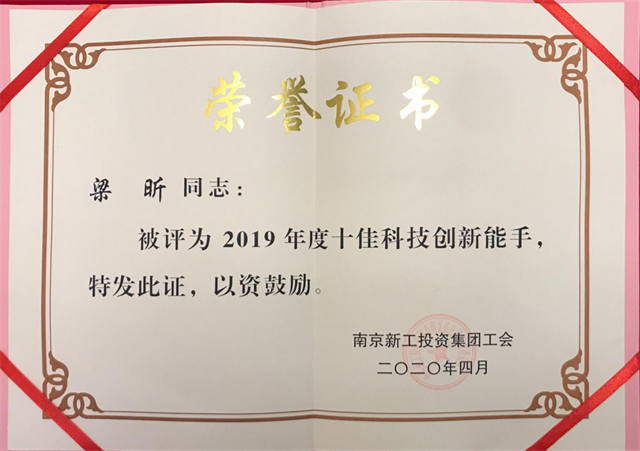 喜报:我院梁昕老师获得南京新工投资集团“2019年度十佳科技创新能手”称号