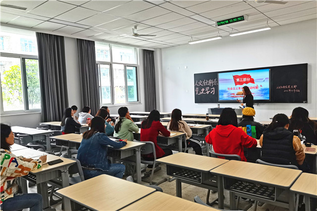 根据学校党委统一部署,深入贯彻习近平总书记在党史学习教育动员大会上的重要讲话精神,激励我校广大教职工坚定理想信念、立足岗位、勤奋学习,4月28日下午,人文社科系党支部全体教职工在博学楼110教室开展了第二次党史学习教育,本次学习由思政中心赵珊珊老师主讲。