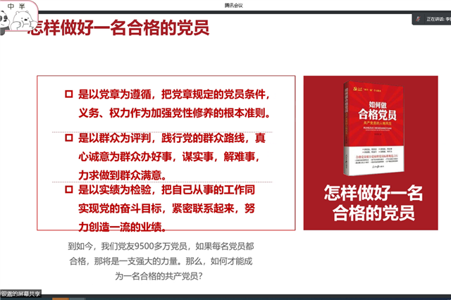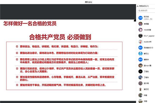 4月19日下午,自动化工程系党支部通过腾讯会议线上开展了《做合格党员》政治学习。本次政治学习由李银露老师担任主讲人,系部全体教职工参加学习。