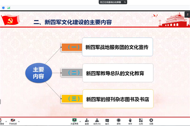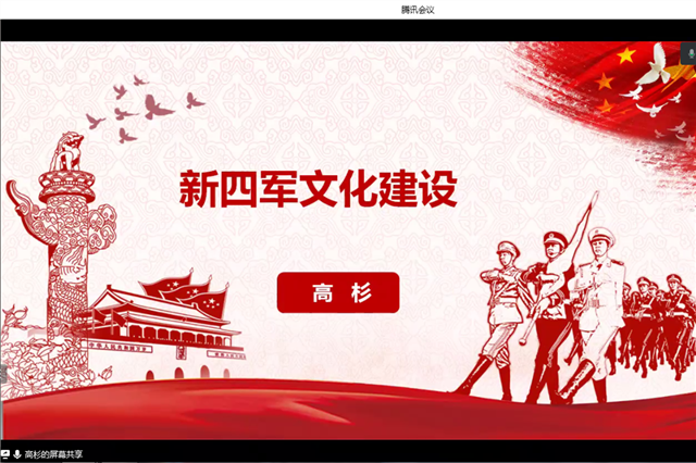 高杉老师以“文化建设铸就新四军特质”为主题,提出新四军自创建之日起,就始终把开展文化工作作为部队全面建设的一项重要内容,大力进行部队文化建设,并从“新四军战地服务团的文化宣传”“新四军教导总队的文化教育”“新四军的报刊杂志图书及书店”三方面详细介绍了新四军的文化建设。最后,她强调文化建设必须要善待、善用知识分子,文化建设必须把民族形势与时代内容有机结合起来,文化建设内容必须注重多样化。