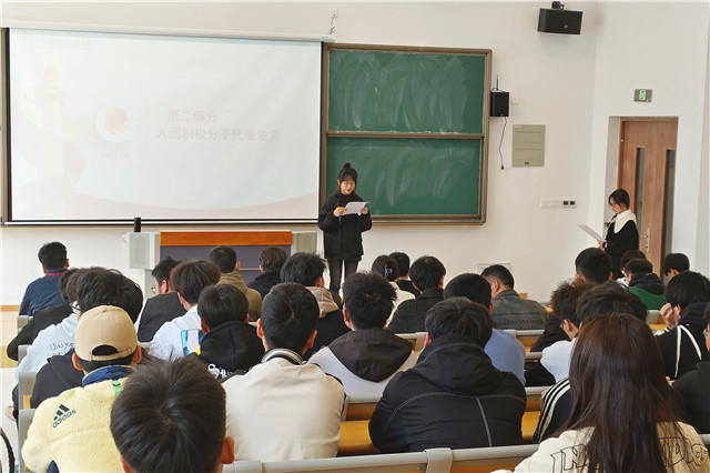伴着庄严激昂的团歌,仪式正式开始。首先,兼职副书记王茜茜宣读了入团积极分子表彰决定。紧接着,杨佳烨同学作为入团积极分子代表发言,她号召全体同学要严格按照团员标准要求自己,不忘初心,坚守信仰,用实际行动接受团组织的考验,争取早日成为一名优秀的共青团员。随后,潘老师为考核合格的学员颁发结业证书并对全体团员提出希冀,希望同学们在今后不断加强学习,坚定正确的思想政治方向,以团的章程要求自己,以团的精神激励自己,牢记使命,争做走在前列的奋进者、开拓者、奉献者。