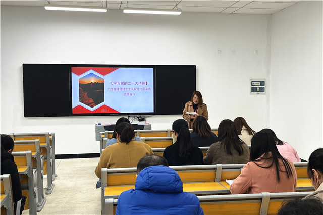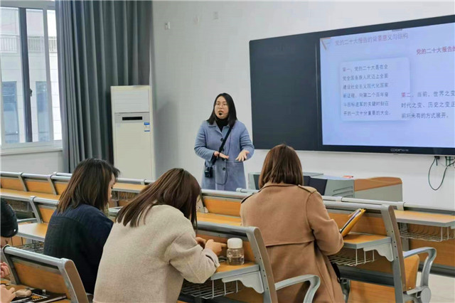 为进一步学习宣传贯彻党的二十大精神,营造奋进新征程的良好氛围,2月28日下午,人文社科系全体教职工在博学楼305教室开展了本学期第一次党史学习教育,本次学习由支部宣传委员赵姗姗主讲。
