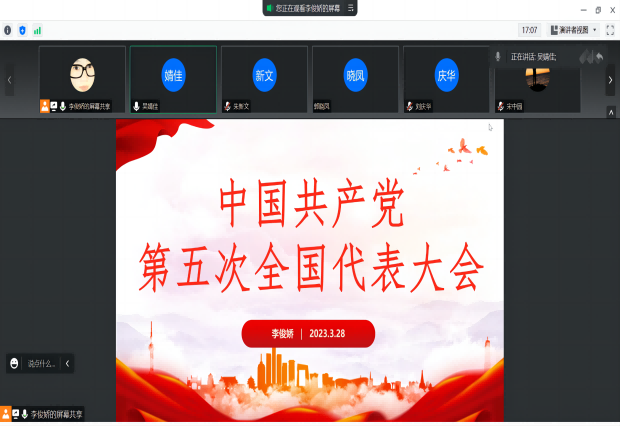 在本次学习中,李俊娇介绍了中国共产党第五次全国代表大会召开的历史背景、过程、大会的历史贡献、意义等。中国共产党第五次全国代表大会于1927年4月27日至5月9日在武昌高等师范第一附属小学召开。大会是在大革命面临严重危机的紧急关头中国共产党在共产国际指导下召开的一次党的重要会议,是处在幼年时期的中国共产党探索中国革命道路艰难历程中的一个重要环节。这次大会探讨了中国革命的一系列基本问题,提出了指导中国革命的一些正确原则,为党的思想理论建设作出了积极贡献;大会初步提出了健全党的领导体制和组织系统的一系列举措。会议所作出的历史贡献,为党在大革命失败后,实现土地革命战争兴起的历史性转变在政治、思想、组织上作了一定的铺垫和准备,同时也为年轻的中国共产党在奋斗中继续探索适合中国国情的革命道路提供了宝贵的经验教训。