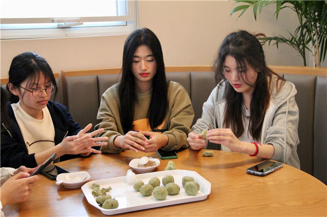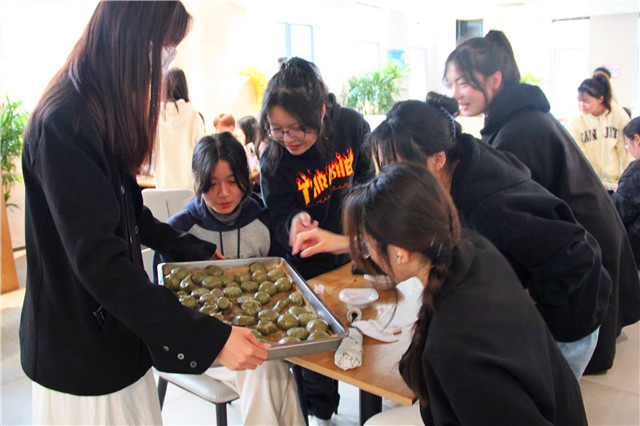 活动在典雅的古风乐曲背景下拉开帷幕,师生们使用当地植物鼠曲草,在当地制作青团的技能师傅指导下,煮汁、和面、包馅儿、造型……