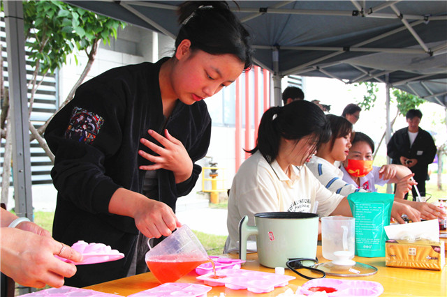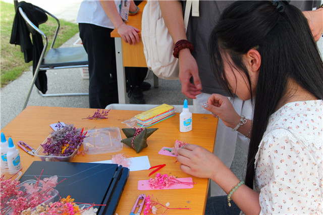 活动现场热闹非凡,老师和同学们手持票券体验着不同的节日游戏,感受到了中国传统文化节日的魅力。在彩绳编织、手工皂、紫草药膏、彩绘鸭蛋、干花书签等手工制作中感受着独有的民俗文化魅力,传递着对周围好友的美好祝愿,让端午节所蕴含的精神价值内化于心、外化于行。