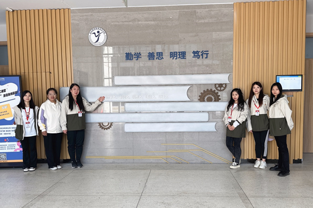 学院LOGO的下方,“勤学、善思、明理、笃行”蓝色大字,彰显学院办学特色,转动的齿轮装饰将主题衬托得更加鲜明。电子工程系的辅导员们坚持“学思用贯通、知信行统一”思想,他们在思学楼留下了自己美好的回忆,更期待每一位走进楼宇的机电学子都能从中汲取力量,学以致用,回报社会