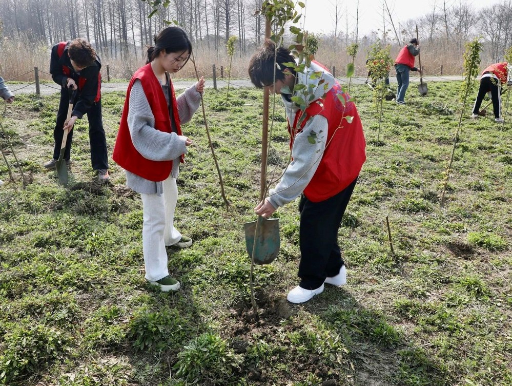 党员和团学骨干一起走进水慢城,以党小组为单位领取植树工具。在植树现场,师生干劲十足,手持锄头、铁锹等工具,挥锄挖坑、扶正树苗、填土压实,大家分工有序,配合默契,将一棵棵承载着希望的树苗栽种进土壤。湖边、道路旁很快就竖起一道道生机勃勃的风景线。这些新栽的树苗,将在水慢城这片土地上扎根,成长为未来的树林,提供清新的空气和宜人的生活环境。